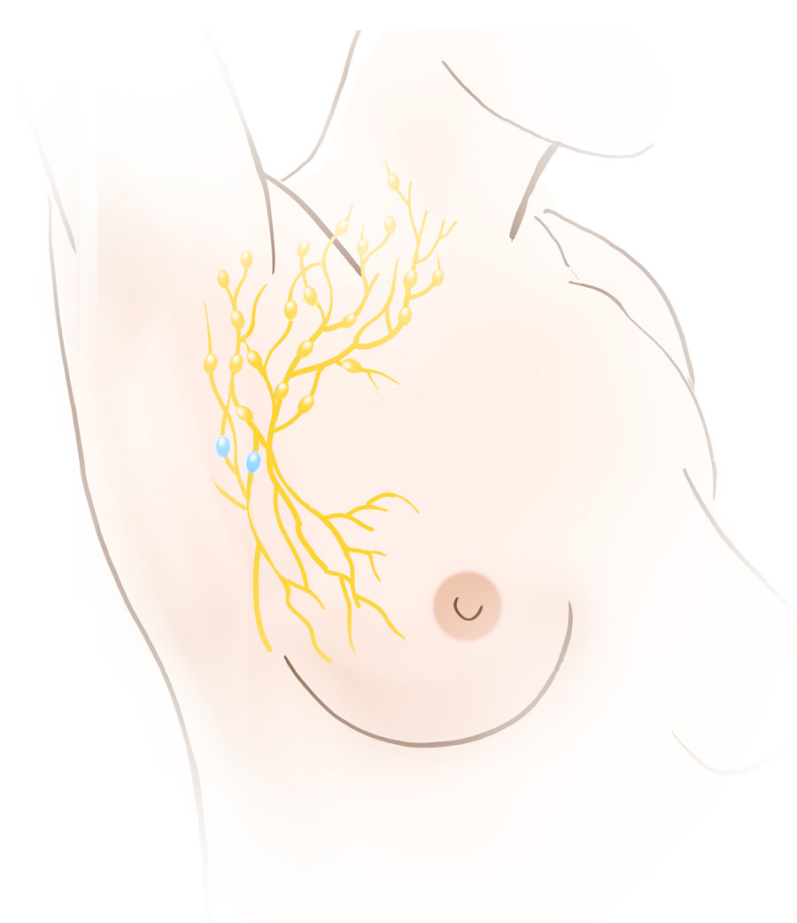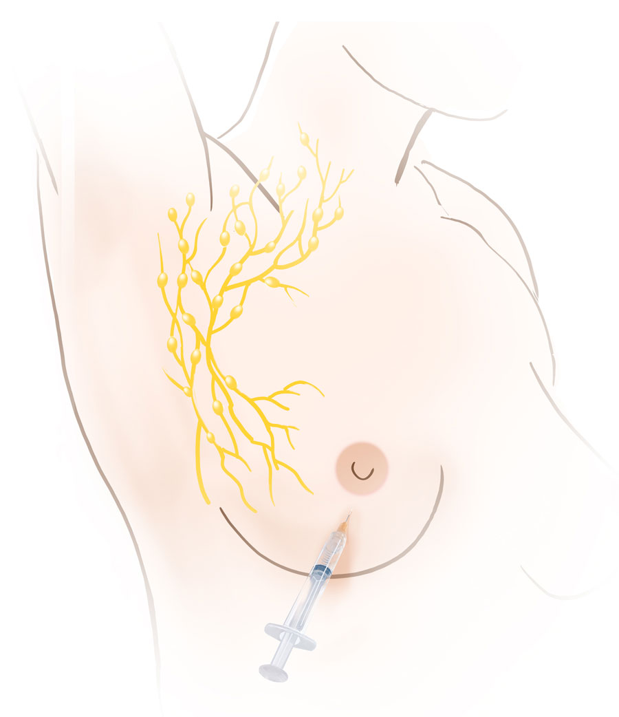 A substance known as a “tracer” is injected into the breast either the day before or the day of the surgery. The tracer may be low dose radioactive material, blue dye, or a magnetic or fluorescent compound. More than one tracer may be used. Once injected, the tracer travels to the underarm lymph nodes. The tracer takes the same pathway through the lymphatics that tumor cells would take if they were to get into the lymph system. A detector is used to identify the lymph nodes that contain the tracer. This indicates to the surgeon that these are the lymph nodes that need to be removed for testing, not that there is cancer in them. If blue dye is used, it is visible to the surgeon. Typically between 1-4 sentinel nodes are removed. The lymph nodes are then sent to the pathologist for microscopic evaluation.