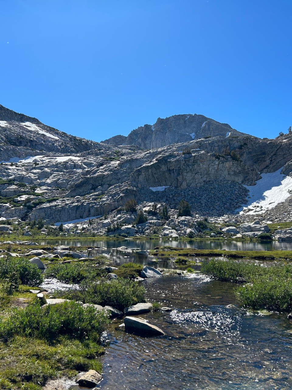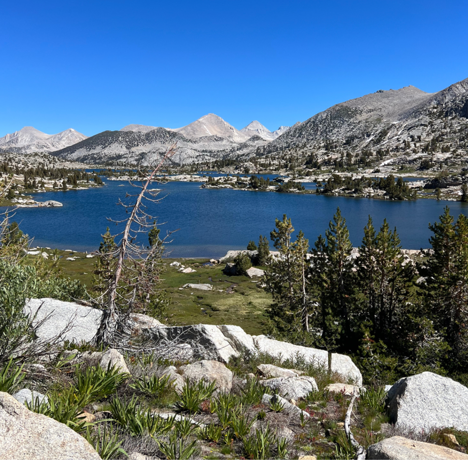 Backpacked 9.6 miles from half-way up Silver Pass. Campsite at 10,000 ft up 1,200 ft over Silver Pass (pass number 3) and descended to 7,700 ft at Vermillion Valley Ranch (VVR, a restocking place for some and not for us, kind of like a resort after a ferry ride across a lake). Made camp near the VVR.
