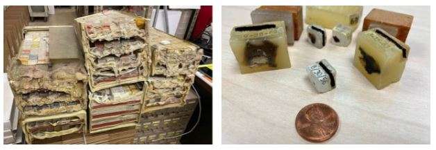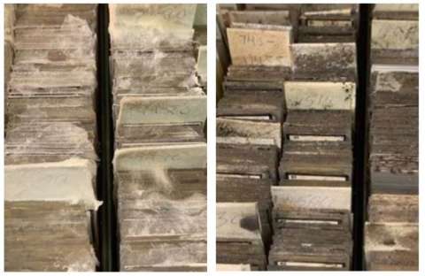 Earlier this year, the Surgical Pathology Reporting Office (SPRO) completed a major effort to evaluate the materials the Department has been storing offsite, to ensure we are storing essential materials under proper conditions. In addition to old paper files that were long past the date that we were required to keep them, SPRO unexpectedly encountered several surprises. This included blocks irreparably damaged in the distant past by fire, water and mold (see photos below) and many broken slides, which led to further work with the Translational Pathology Core Laboratory (TPCL) to evaluate slide and block research requests. As a result of these efforts, we decided to dispose of our oldest slides and blocks. Overcoming complications from the pandemic and supply chain delays, the SPRO team and collaborators were able to complete the project in just over two years.