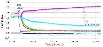 Figure 1. Cytotoxicity to cancer cells by cytotoxic T lymphocyte (CTL). xCELLigence real time impedance plots at various effector target ratio (E:T 0:1). Negative control: cancer cells only. Positive control: cancer cells lysed with 1% triton x-100.