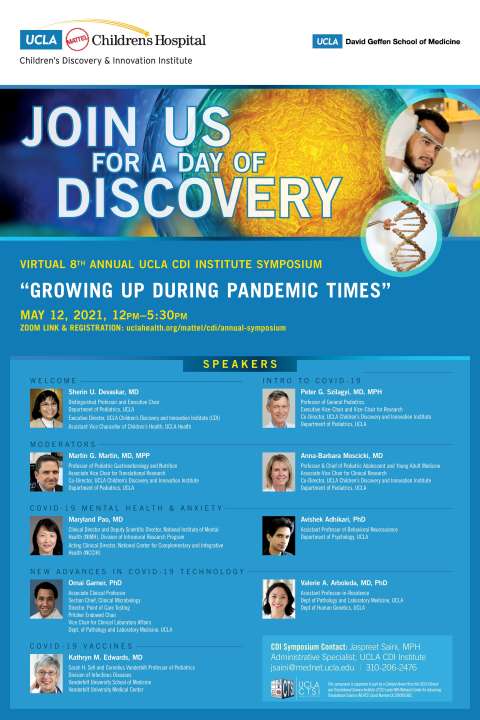 The 8th Annual UCLA Children’s Discovery and Innovation Institute (CDI) Symposium was hosted at UCLA on May 12, 2021 to generate cross-campus collaborations to advance translational child health research. The UCLA CDI Institute is the research home of the Pediatrics Department and was established in 2013. The CDI Institute encourages multidisciplinary child health research and training at UCLA across the spectrum of basic, translational, clinical and health services research. The 2021 Symposium featured Keynote Speakers Maryland Pao, MD and Kathryn M. Edwards, MD and UCLA speakers, Avishek Adhikari, PhD, Omai Garner, PhD, and Valerie A. Arboleda, MD, PhD.