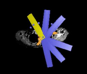 The second row shows images (axial, coronal, and sagittal) of the distribution of the radiation dose that was delivered to this area. One can see that the dose of radiation to this target is very tightly distributed to avoid as much normal tissue as possible.