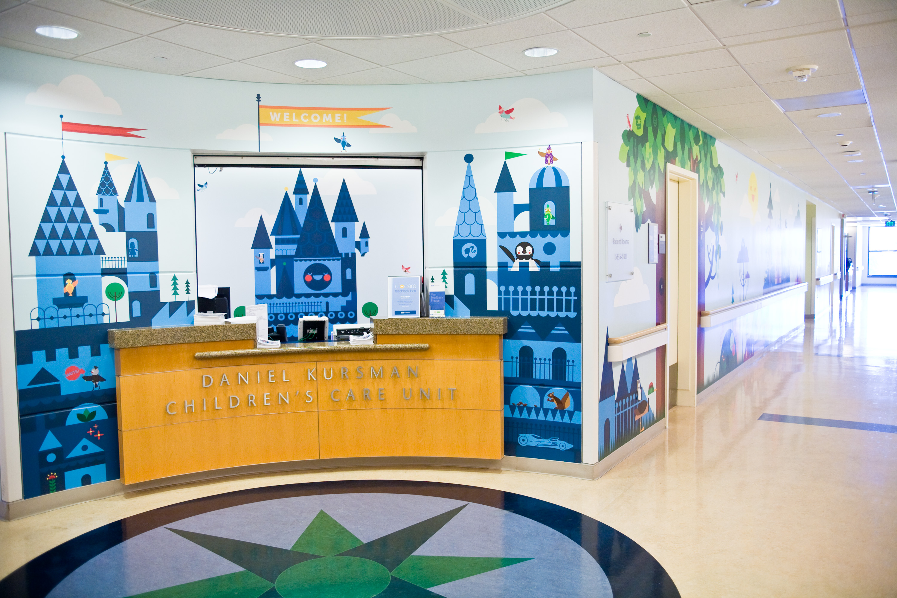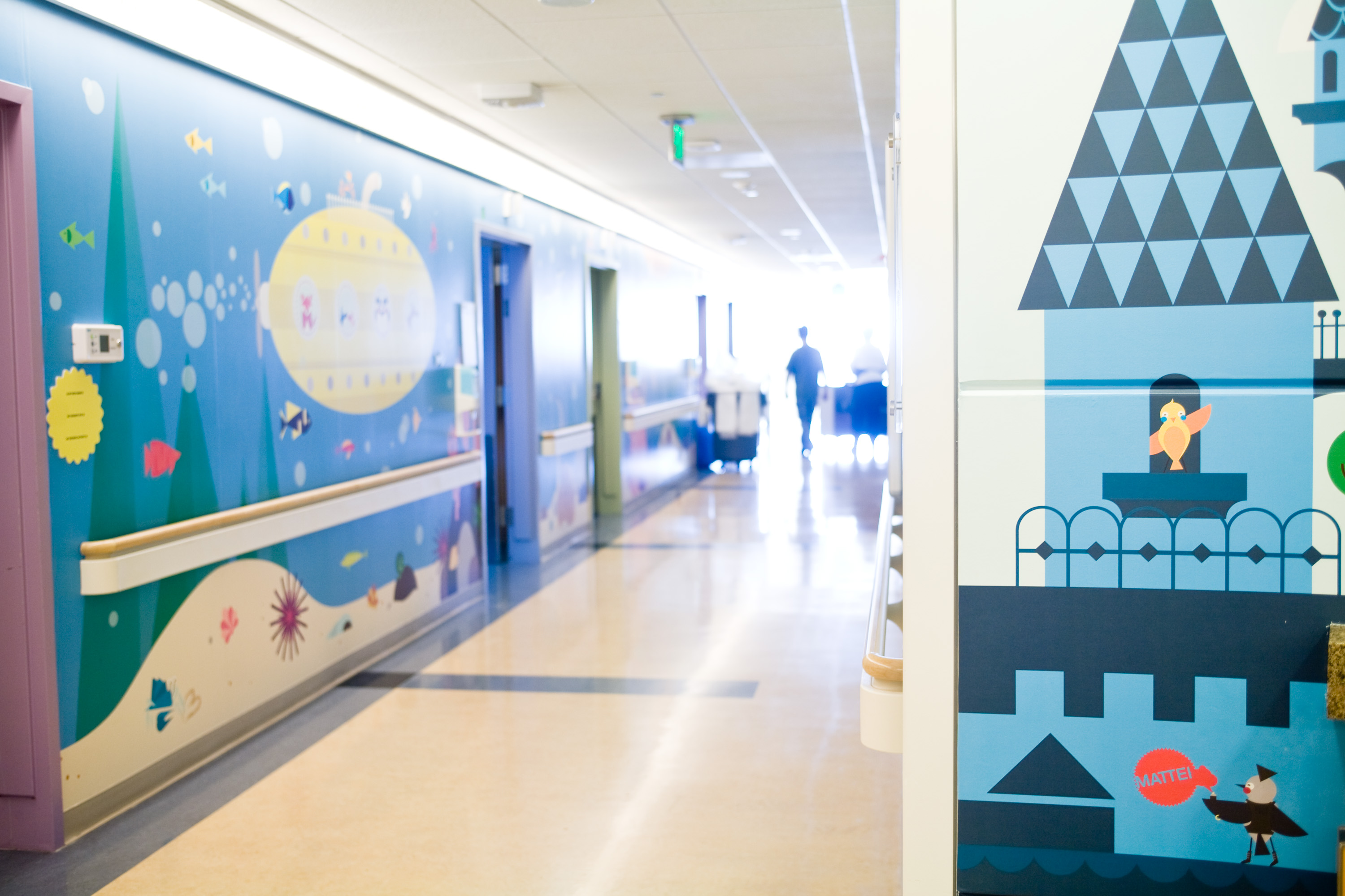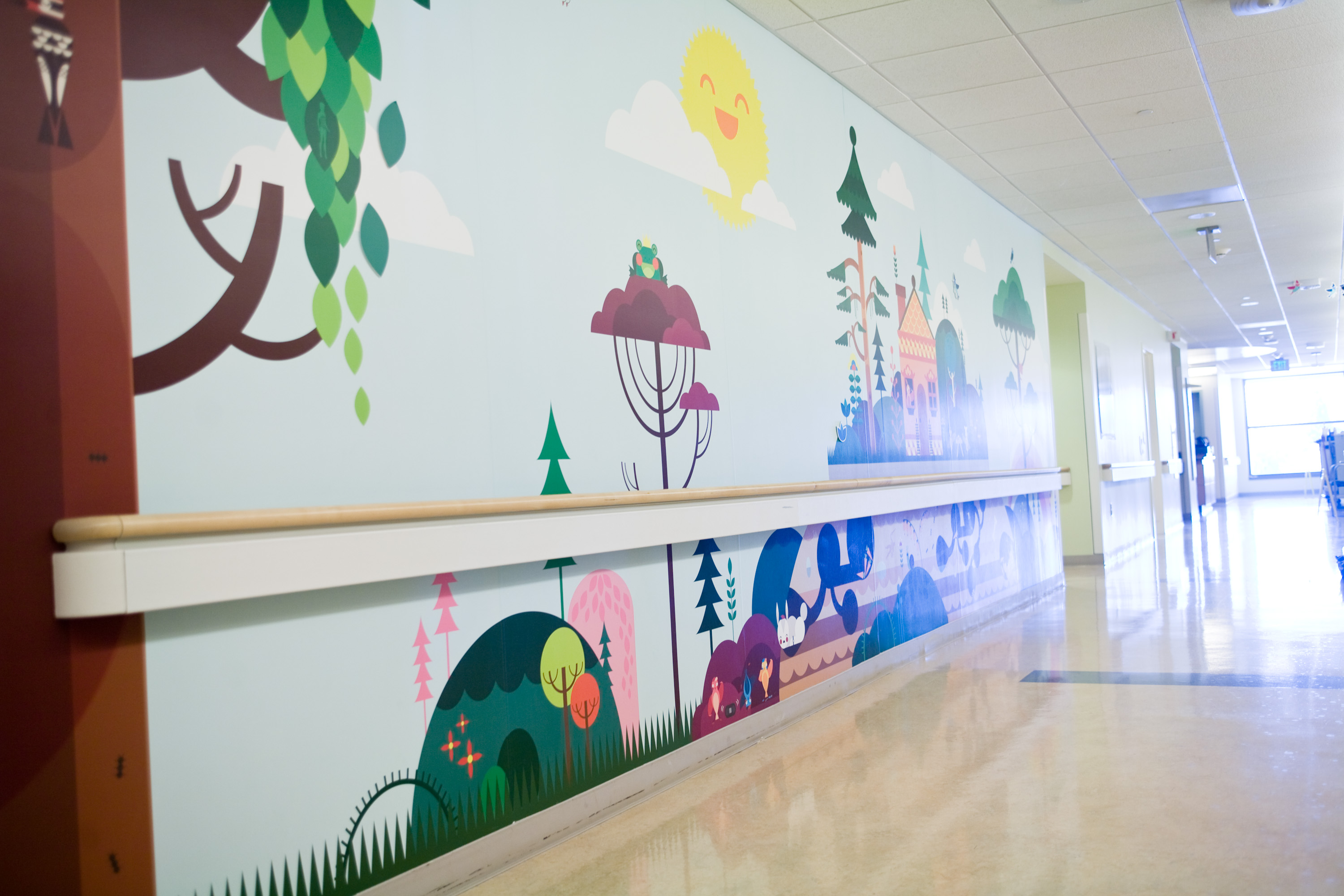 "One child was so excited to see all the characters around the wall, she walked all around the unit, despite her discomfort following surgery. The young girl said she wanted 'to see all of the pictures' before returning to her room," remarks Amy Bullock, director of UCLA's Chase Child Life department. "The murals add positivity to the unit and put smiles on everyone's faces."
