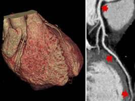 Right: Curved reformatted image of the left anterior descending artery displays coronary artery with high detail information including visualization of small side branches.