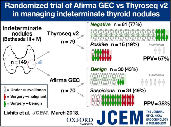 Figure 1. Since 2012, indeterminate thyroid nodules evaluated at UCLA have undergone molecular testing to further assess the risk of cancer in the nodule. A large number of patients who have a "benign" molecular test result can then avoid an operation for diagnosis. Of those who went on to have an operation after a benign result, no cancers were found on final pathology. When the molecular test returned "suspicious," the majority of those patients proceeded to a diagnostic partial thyroidectomy, and cancer was found in 38-57% of those patients depending on the molecular test used.