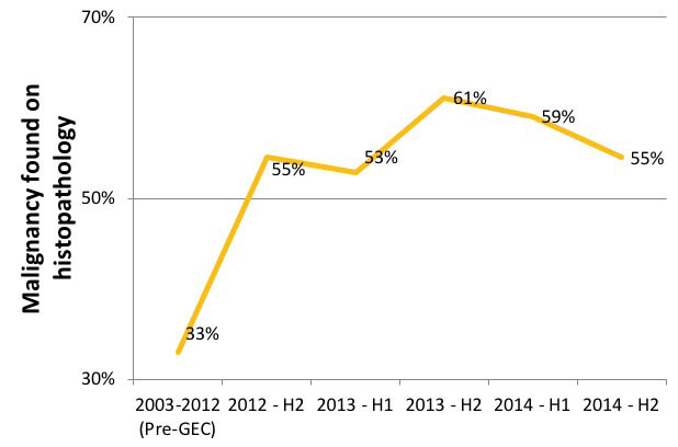 Figure 2. Prior to the introduction of molecular testing in 2012, patients undergoing partial thyroidectomy for diagnosis of an indeterminate nodule were found to have cancer on final pathology only 33% of the time. Once molecular testing was implemented, the majority of patients having surgery for diagnosis of an indeterminate nodule were found to have cancer (53-61%). This immediate change in the "malignant yield" of surgery can be explained by the fact that many patients with a benign molecular test result were able to avoid diagnostic surgery.