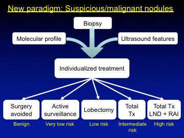 Figure 3. Patients presenting with suspicious or malignant thyroid nodules now have many more options than even a decade ago, as molecular testing, surgeon-performed ultrasound, and new national guidelines have allowed for individualized care. Historically, most patients with a suspicious biopsy result would have a thyroid lobectomy for diagnosis, and those with thyroid cancer would typically undergo total thyroidectomy with lymph node dissection and post-operative radioactive iodine. Now, molecular testing can allow some patients with suspicious nodules to avoid surgery with or without active surveillance. Patients with thyroid cancer can often be treated successfully with thyroid lobectomy if the tumor is low-risk by ultrasound and pathologic features or with total thyroidectomy alone for intermediate-risk tumors.