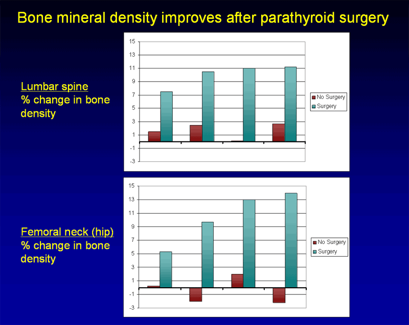 Improvements in bone mineral density following parathyroid surgery are very well established, and patients can routinely expect these benefits soon after surgery. Bone mineral density will significantly increase in the year following surgery, and continue to increase over the next 10 years.