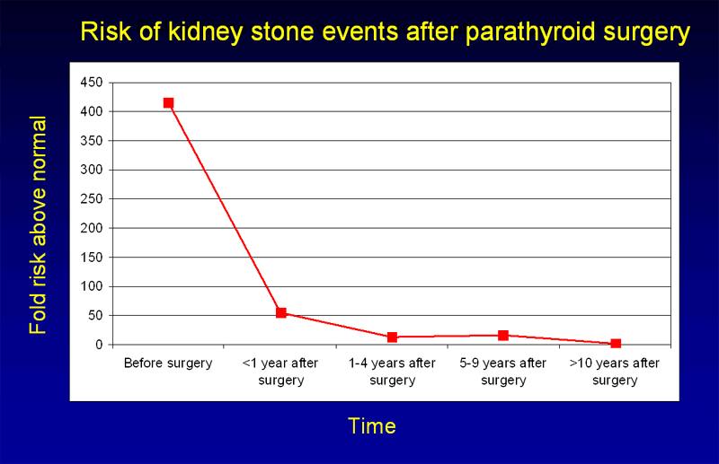 Reduction in kidney stone events after parathyroid surgery. Immediately prior to surgery, the risk of stone events is approximately 400 times normal. That risk rapidly declines during the first year following surgery, though a return to completely normal risk levels takes several additional years. (Adapted from Mollerup, BMJ 2002). Larger image.