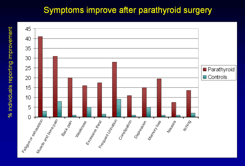 It is now well known that patients with primary hyperparathyroidism report an overall improvement in their quality of life after surgery. This is related to an improvement in a number of areas: fatigue, exhaustion, pain in the muscles and bones, weakness, frequent urination, constipation, depression, and others. Sometimes these symptoms have come on so slowly that patients do not recognize they have been affected until after they improve. These following symptoms may also improve after parathyroid surgery in some patients, but not all, after parathyroid surgery.