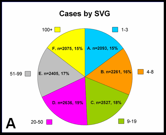 - The number of cases performed by each surgeon volume group is indicated by the colored squares.