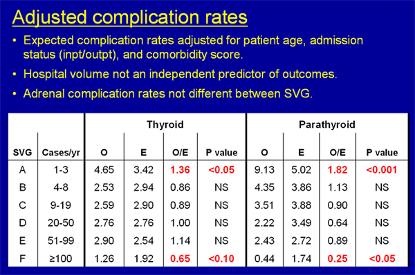 One of the most comprehensive studies on outcomes in endocrine surgery was published by Stavrakis, Ituarte, Ko, and Yeh from UCLA in 2007 (3) . Our study examined 14,000 operations on the thyroid, parathyroids, and adrenal glands performed in the states of New York and Florida in the year 2002. The report was the first to encompass both inpatient and outpatient operations, the latter of which make up a growing proportion of endocrine procedures. Surgeons were categorized into six surgeon volume groups (SVG) in the following manner: