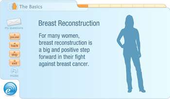 The EMMI viewer will help you develop a better understanding of breast reconstruction. You'll learn how a procedure works, what to expect when you go home, what to do before and after your surgery, the risks, benefits and alternatives. You'll have the opportunity to identify questions as you think of them, and print a handy reminder sheet to bring to discuss with your doctor during your pre-op visit. Our hope is that you will be more knowledgeable and confident throughout your treatment process.