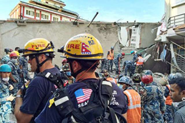 I’d seen nothing like this before — collapsed buildings and quite a bit of devastation of world cultural heritage sites, all sorts of temples. We set up our base of operations on the grounds of the U.S. embassy with a command tent, medical and sleeping tents, and then we went to our assigned sector. Search and rescue teams from the United States, China, India and other nations were working in different sections of the city.