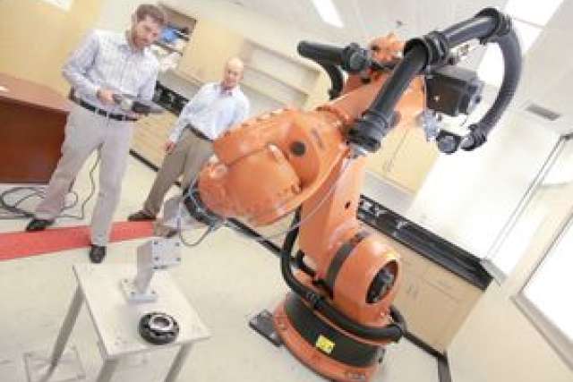 Bioengineering researcher Keith Markolf frequently gets this question when colleagues visiting from around the world first lay eyes on the 8-foot-tall, pumpkin-orange behemoth dominating the UCLA Orthopaedic Biomechanics Laboratory at UCLA’s Rehabilitation Center. The industrial robot, diverted from a thankless job in an auto assembly plant in Detroit, has taken on a second life as an explorer into the workings of the human knee.