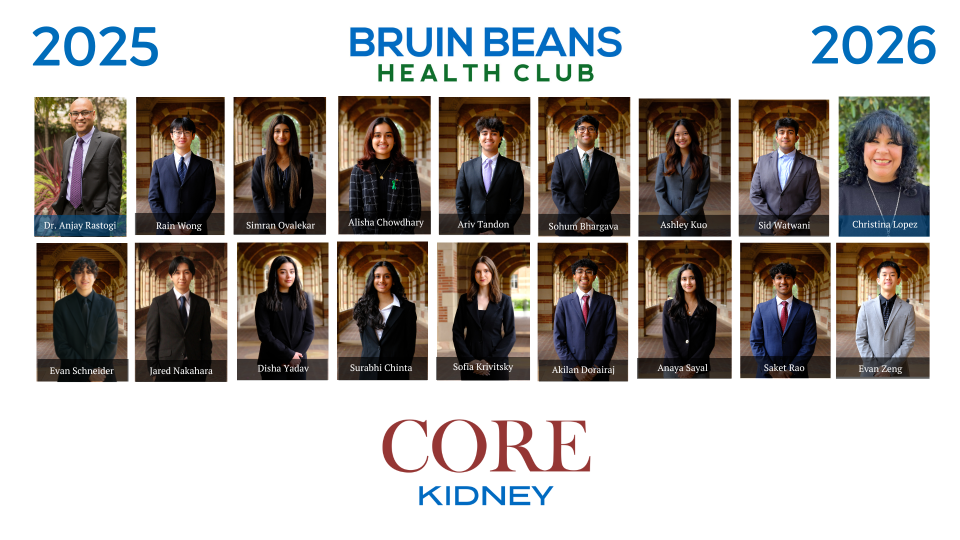 Bruin Beans Health Club (BBHC) is composed of undergraduates and recent alumni working with nephrologists at UCLA's David Geffen School of Medicine and UCLA CORE Kidney to improve healthcare delivery to patients with kidney disease by implementing CORE values of Clinical Excellence, Outreach, Research, and Education. We work with a multidisciplinary team of healthcare professionals in order to communicate and bridge the gap of misinformation surrounding kidney health and increase societal awareness, community knowledge, and the medical body of literature on kidney disease and disease prevention through clinical research.