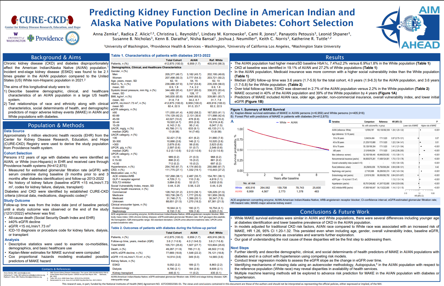 Breadcrumb Home Departments Cure CKD Cure CKD Projects & Publications Sub-navigation Cure CKD About Us Available Data & Definitions Contact Us Our Team Trainees Partner Institutions Projects & Publications Cure CKD More Close About Us Available Data & Definitions Contact Us Our Team Trainees Partner Institutions Projects & Publications Close Podcast on Diabetic Kidney Disease Podium Presentation ASN 2023 Presentation: Predictors of Major Adverse Kidney Disease Events in a Real-World Population With IgA Nephropathy Presentation ASN 2023 Presentation: Kidney Failure Risk Equation Prediction in a Real-World Population with Chronic Kidney Disease ASN Presentation 2023: Incidence of Chronic Kidney Disease in Prediabetes AIM-AHEAD Annual Meeting 2024: Predicting Kidney Function Decline in African American populations with Diabetes: a CURE-CKD registry analysis 2013-2022 Project Flowchart The Diabetes Divide ASN 2023 Presentation: Major Adverse Kidney Disease Events in a Real-World Population with Diabetes ASN 2023 Presentation: Dynamic Bayesian Networks (DBN) predicted ≥40% decline in eGFR over six years AIM-AHEAD Annual Meeting 2024: Predicting Kidney Function Decline in American Indian and Alaska Native Populations with Diabetes: Cohort Selection Published Abstracts Published Abstracts from JASN Kidney Week 2024 Published Abstracts from JASN Kidney Week 2020 Published Abstracts from JASN Kidney Week 2023 Published Abstracts from JSAN Kidney Week 2019 Published Abstracts from JASN Kidney Week 2022 Published Abstracts from JASN Kidney Week 2018 Published Abstracts from JASN Kidney Week 2021 Peer-Reviewed Research Incidence of Chronic Kidney Disease among Adults with Diabetes, 2015-2020 Clinical Characteristics of and Risk Factors for Chronic Kidney Disease Among Adults and Children An Analysis of the CURE-CKD Registry Rationale and design of a multicenter Chronic Kidney Disease (CKD) and at-risk for CKD electronic health records-based registry: CURE-CKD Prescription of guideline-directed medical therapies in patients with diabetes and chronic kidney disease from the CURE-CKD Registry, 2019-2020