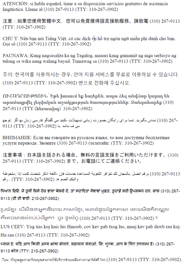 We provide free aids and services to people with disabilities to communicate effectively with us, like qualified sign language interpreters and written information in other formats (large print, audio, accessible electronic formats, other formats). We also provide free language services to people whose primary language is not English, like qualified interpreters and information written in other languages. If you need these services, contact (310) 267-8001 or visit uclahealth.org/Interpreters/.