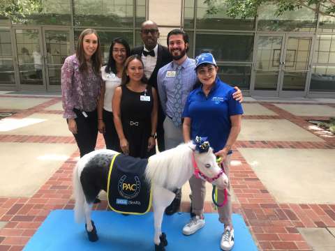 UCLA People-Animal Connection (PAC) is one of the most comprehensive Animal-Assisted Therapy and Activity programs in the nation. In 2018, PAC welcomed a Blue Moon, a miniature therapy horse as the first therapy animal other than a dog to visit Ronald Reagan UCLA Medical Center in 24 years. The 28-inch tall mini-horse is the first miniature horse out of 75 dogs to be part of the People-Animal Connection program